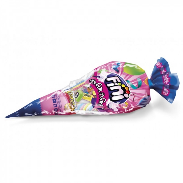 Bolsa em forma de cone recheada com diversas gomas e doces, ideal para oferecer como brinde.